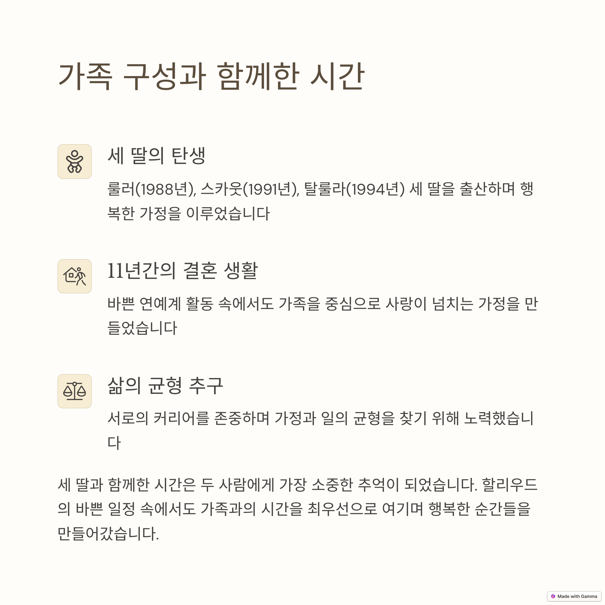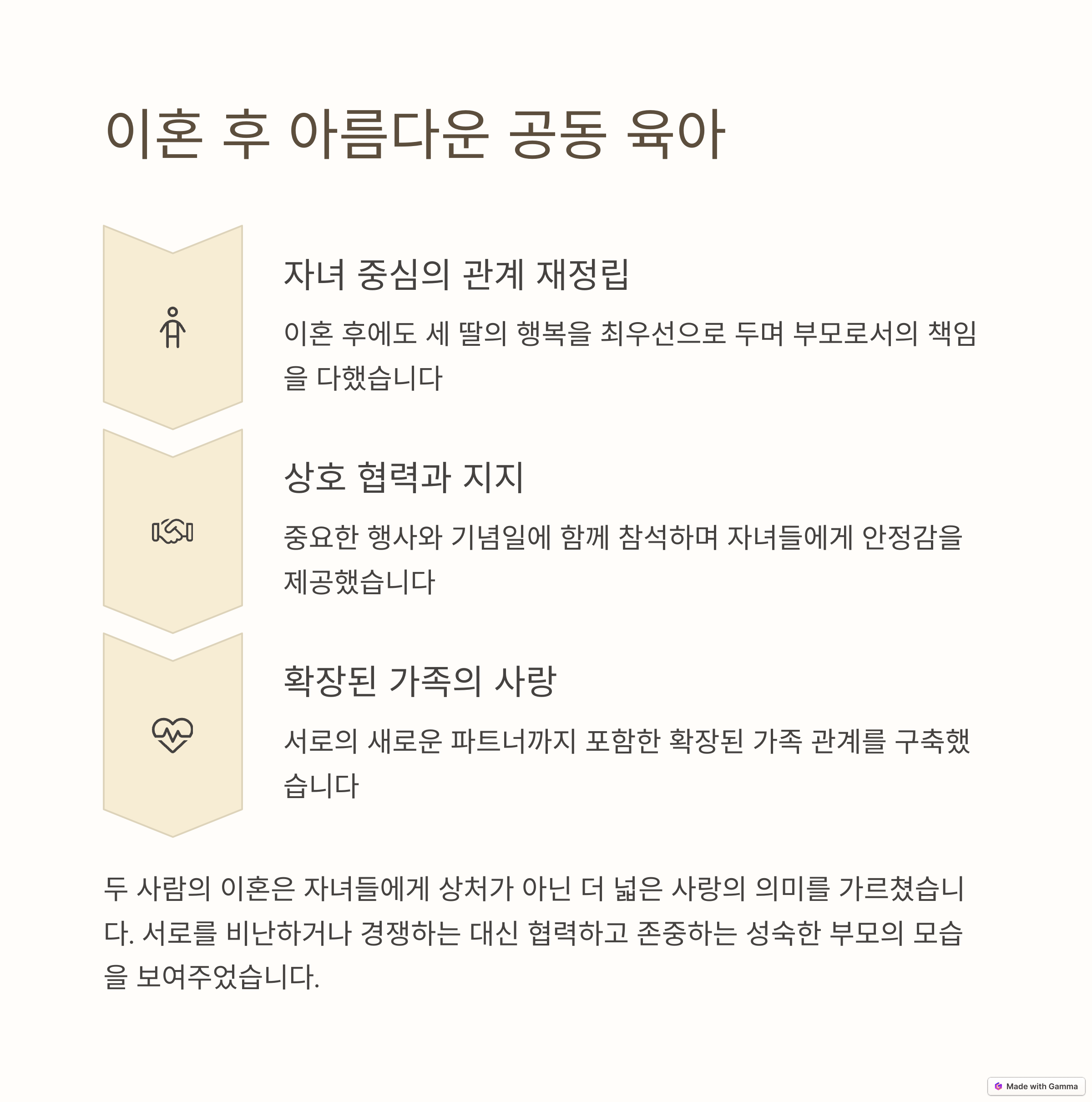 둘째, 서로 다른 사람과의 만남에서 존중과 이해가 가장 중요하다는 점을 강조합니다. 브루스와 데미는 새로운 배우자들과의 관계에서 서로의 감정을 존중하며, 서로 다른 사람들과도 행복을 찾았습니다. 그들은 이혼 후에도 각자의 삶을 존중하고, 자녀들에게 긍정적인 영향을 미치는 데 집중하고 있습니다.