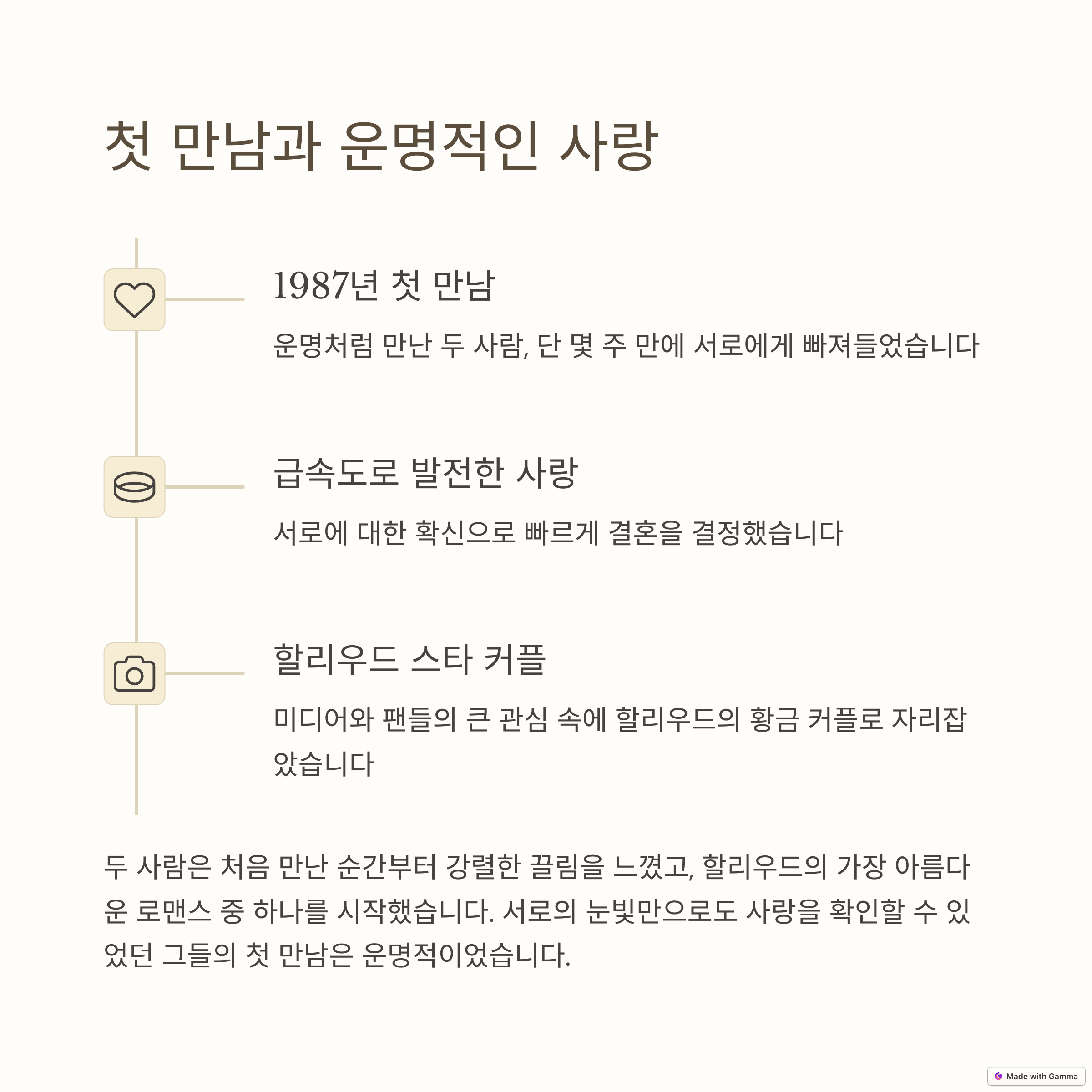 데미 무어와 브루스 윌리스는 1987년, 한 영화 시상식에서 처음 만났습니다. 당시 데미 무어는 이미 영화 '고스트'와 'A Few Good Men'으로 큰 성공을 거두며 할리우드의 톱스타로 자리잡고 있었고, 브루스 윌리스는 '다이 하드'로 국제적인 스타가 되어 있었습니다. 두 사람은 그 시점에서 각자 바쁜 커리어를 이어가고 있었지만, 시상식에서 서로를 처음 마주친 순간 강한 끌림을 느꼈습니다.