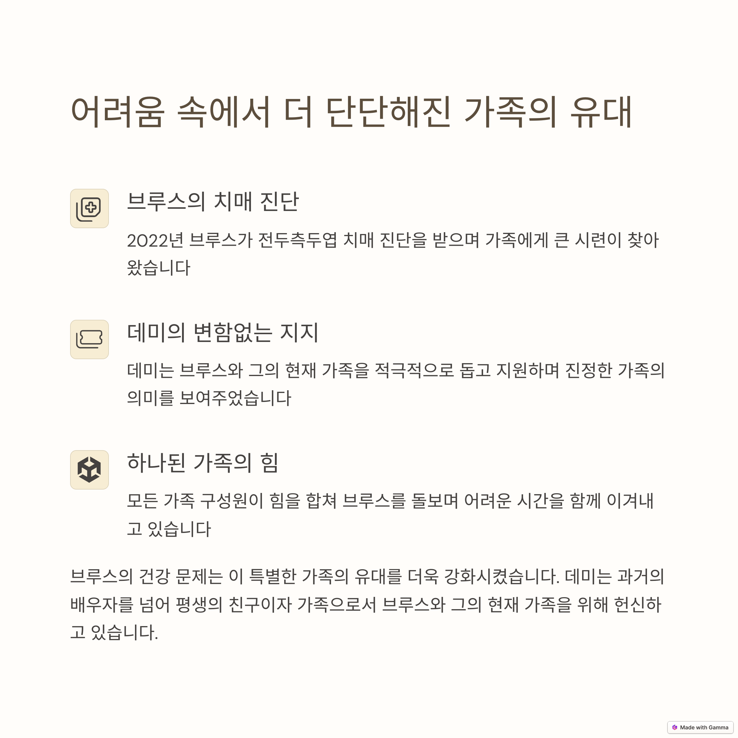 셋째, 변화와 성장의 기회로서 이혼을 바라보는 시각을 배우게 됩니다. 데미와 브루스의 이야기는 인생에서 어떤 변화도 끝이 아니며, 그 속에서 우리는 새로운 기회와 성장을 경험할 수 있음을 가르쳐줍니다. 이들의 삶을 통해 우리는 '어떤 일이 일어나도 다시 시작할 수 있다'는 긍정적인 메시지를 받을 수 있습니다.