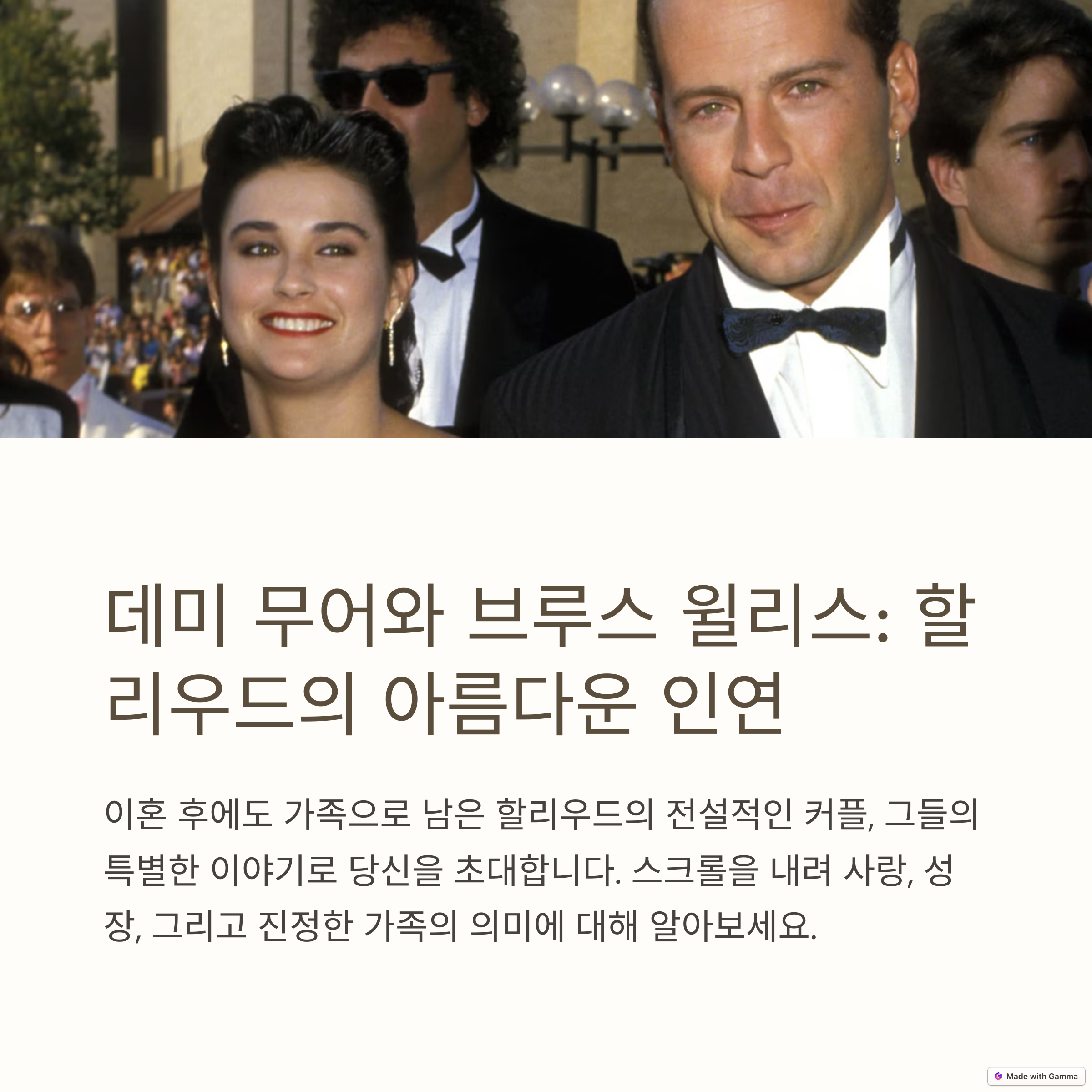 데미 무어(Demi Moore)와 브루스 윌리스(Bruce Willis)의 사랑과 결혼 이야기는 할리우드 역사상 가장 유명하고도 복잡한 연애 이야기 중 하나로 손꼽힙니다. 그들의 만남은 단순히 두 유명 인물이 우연히 만나 사랑에 빠진 것이 아니었습니다. 그들의 러브스토리는 두 사람의 커리어와 삶의 중요한 전환점과 얽혀 있으며, 결혼과 이혼 후에도 여전히 사람들에게 큰 관심을 받고 있습니다. 이번 글에서는 데미 무어와 브루스 윌리스의 결혼 전 만남과 러브스토리, 그리고 결혼 후의 삶, 이혼 후 만난 새로운 배우자들과 그들의 삶이 우리 세대에게 주는 교훈을 자세히 살펴보겠습니다.