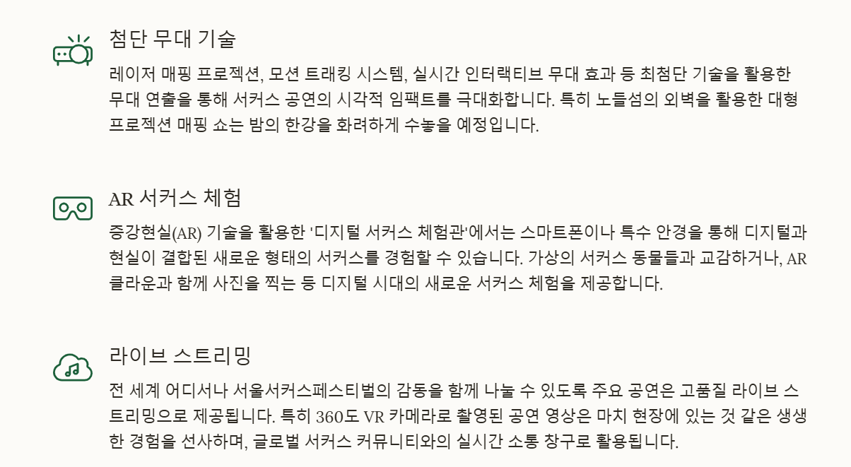 서울서커스페스티벌은 전통적인 서커스를 넘어 현대적이고 창의적인 예술 요소를 결합하여 모든 연령층이 즐길 수 있는 독특한 경험을 제공합니다. 이번 봄, 노들섬에서 세계적인 서커스를 무료로 즐길 수 있는 특별한 기회를 놓치지 마세요!