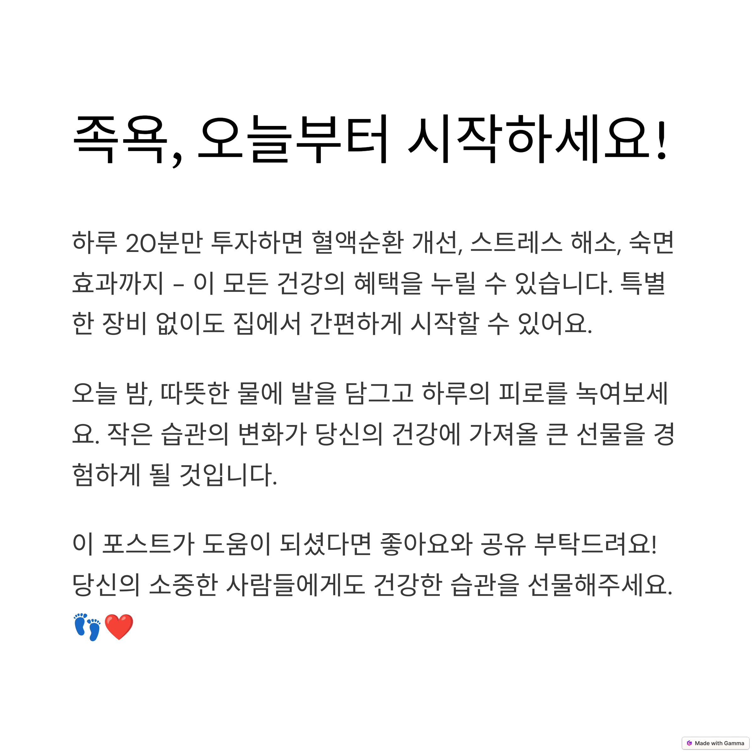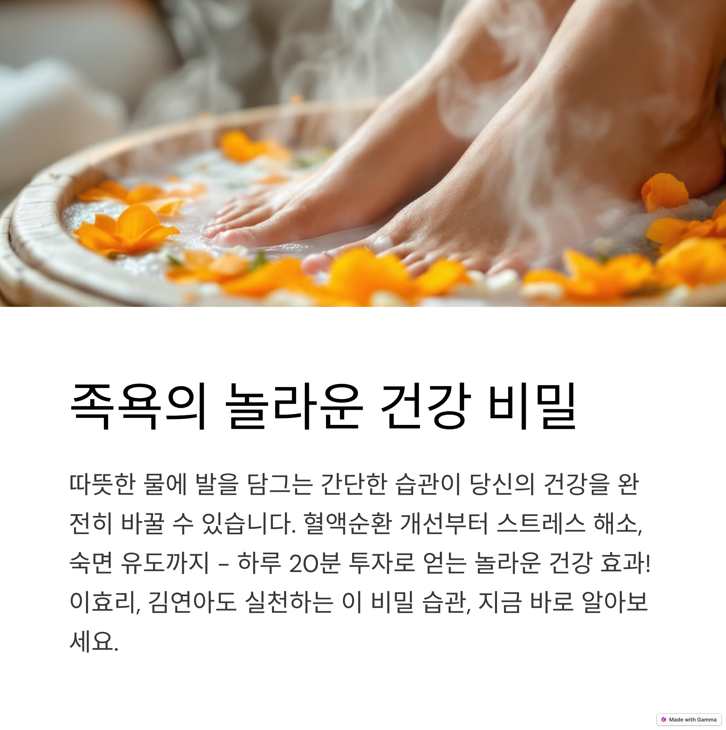 족욕은 간단하지만 강력한 건강 관리 방법으로, 혈액 순환을 개선하고 스트레스를 해소하며, 숙면과 디톡스를 촉진하는 데 효과적입니다.