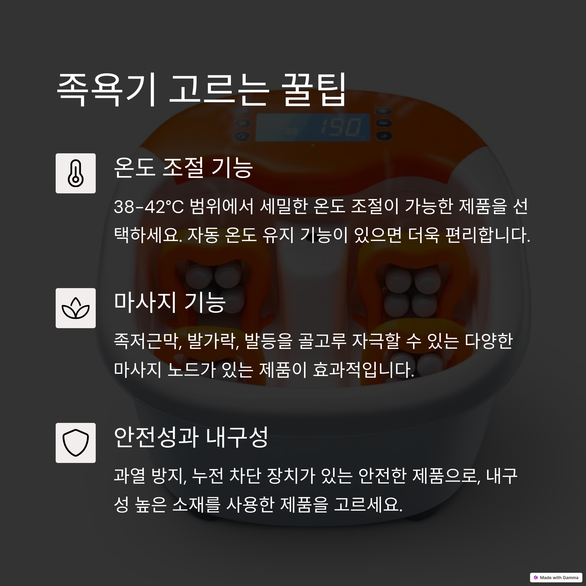 족욕기는 안전성과 내구성이 매우 중요합니다. 사용 중에 물이 새거나, 온도 조절이 잘 되지 않으면 불편함을 겪을 수 있습니다. 고품질의 방수 소재로 제작된 제품을 선택하면 더욱 안전하게 사용할 수 있습니다. 또한, 내구성이 좋은 제품을 선택하면 오랜 기간 동안 편리하게 사용이 가능합니다. 제품의 리뷰나 사용자 경험을 참고하여 내구성이 뛰어난 제품을 고르는 것이 좋습니다.