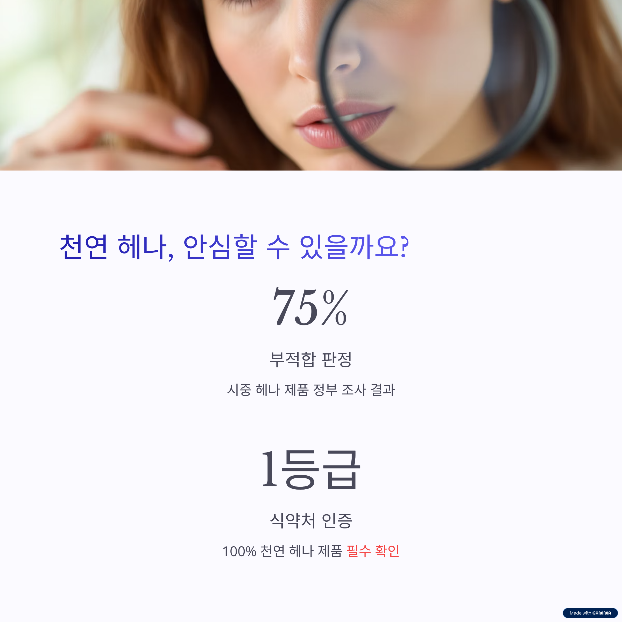 식약처 인증 1등급 100% 천연헤나만을 고집하는 전문 헤나샵을 선택하면 부적합 제품 걱정 없이 건강하게 염색할 수 있습니다