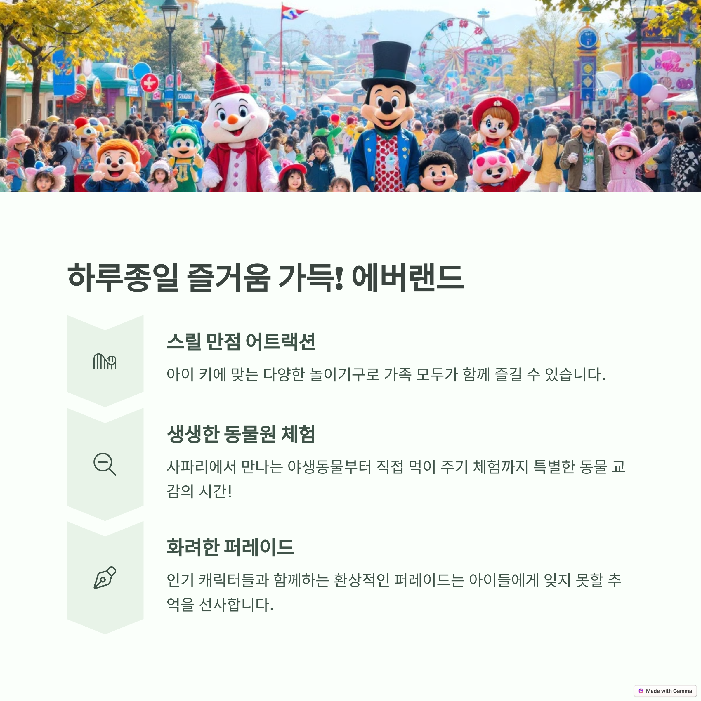 - 인기 이유: 국내 최대 테마파크로 어린이를 위한 특별 이벤트와 캐릭터 퍼레이드가 열립니다.