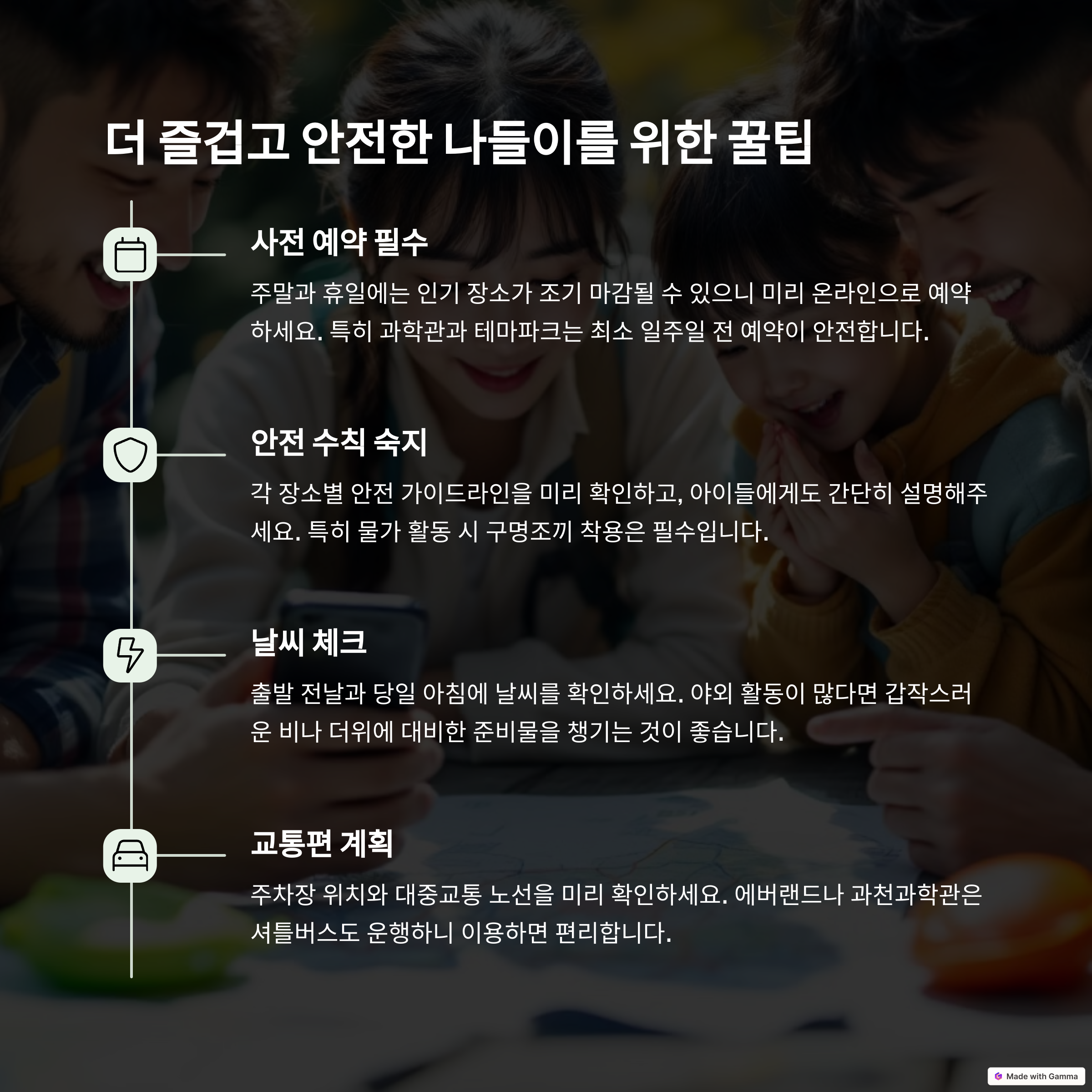 어린이날을 더욱 즐겁고 안전하게 보내기 위해 각 장소별로 준비물과 유의사항을 꼼꼼히 확인하세요. 아래는 2025년 어린이날 인기 장소 7곳에 대한 상세 정보와 방문 시 필요한 준비물, 주의해야 할 점들을 정리한 내용입니다.