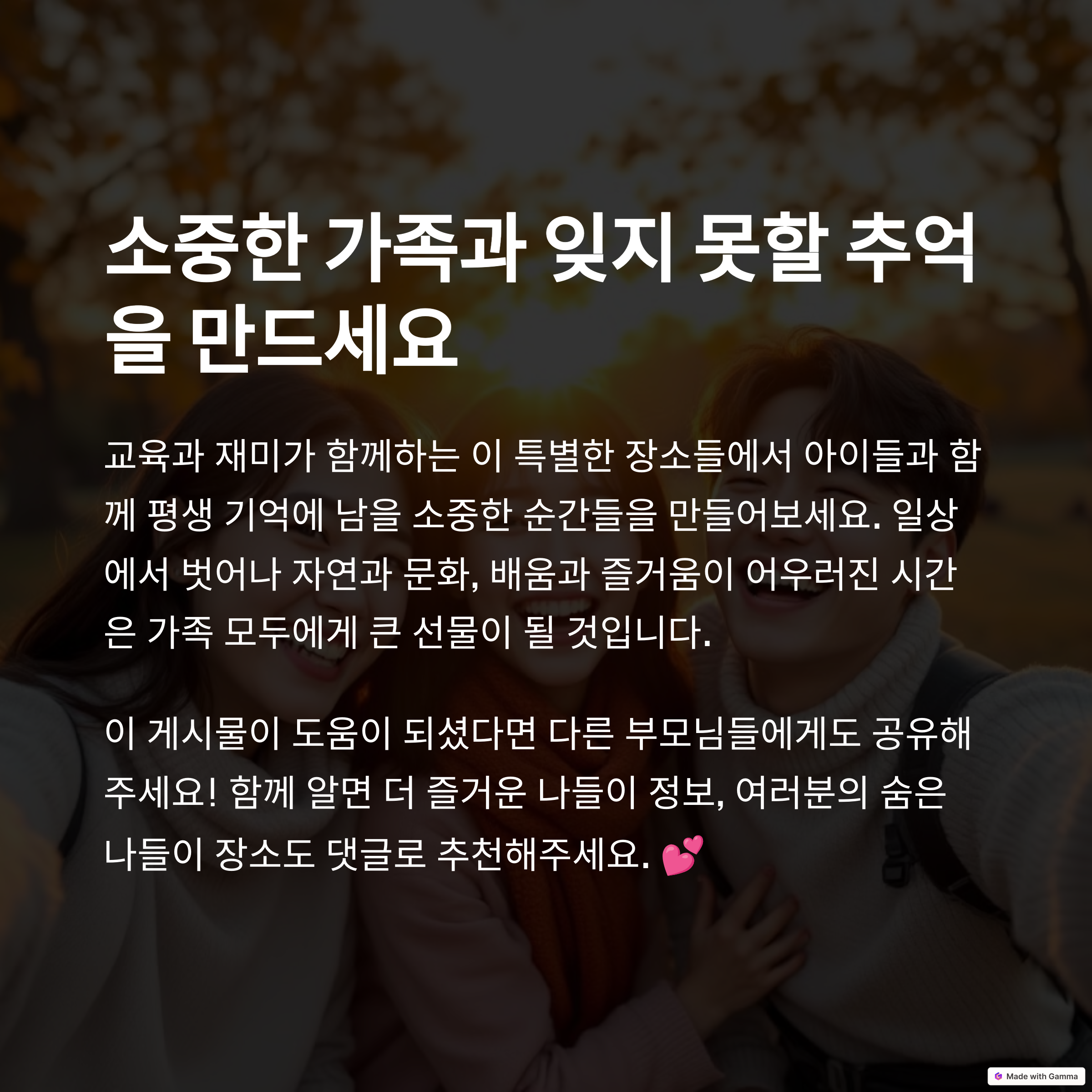- 인기 이유: 동물원, 놀이기구, 대형 공연장 등 다양한 시설을 갖춘 서울의 대표적인 어린이 명소입니다. 캐릭터 퍼레이드와 야외 콘서트 등 특별 이벤트가 열립니다.