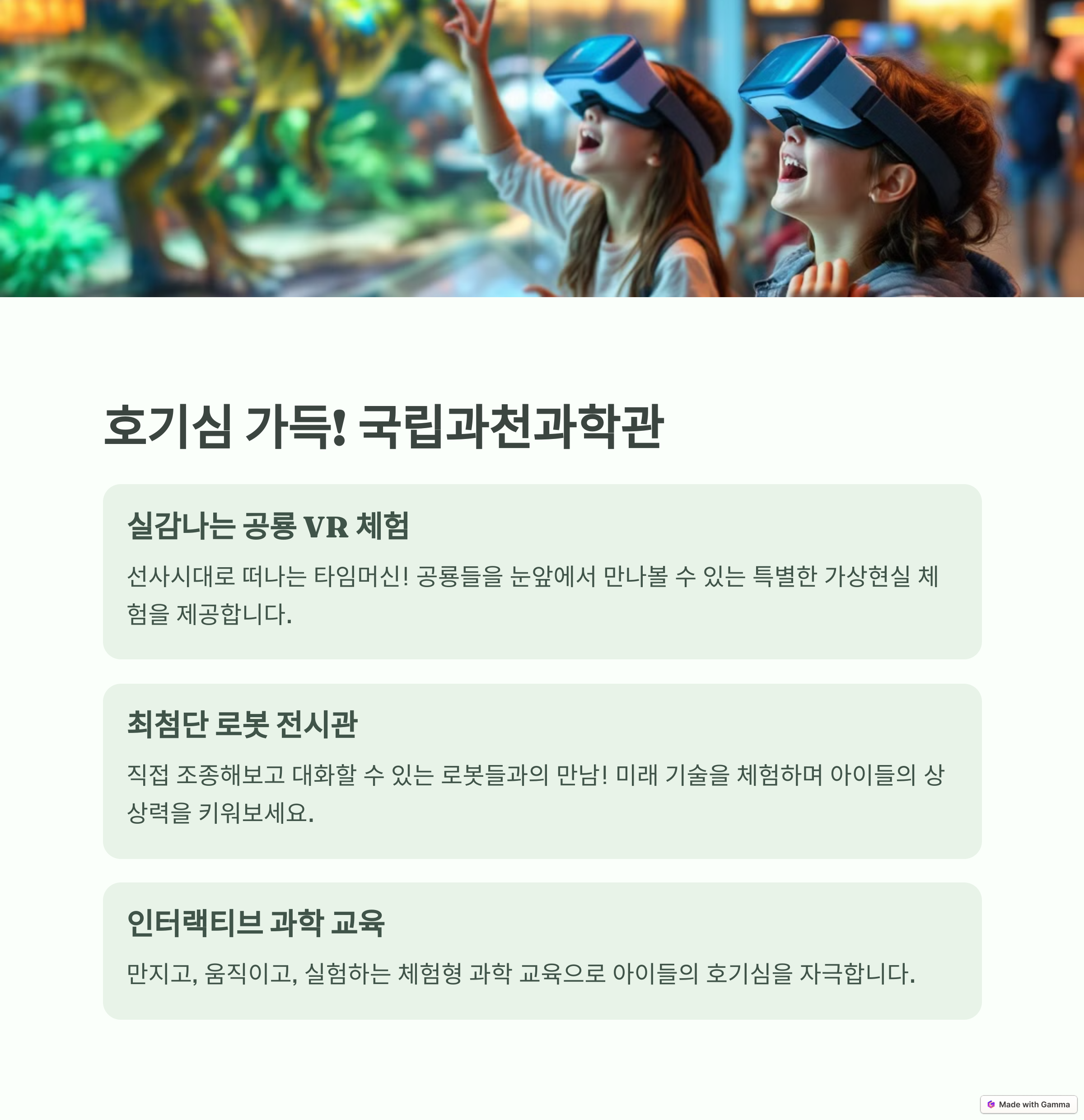 - 인기 이유: 과학 체험형 전시와 프로그램으로 교육적이고 재미있는 활동을 제공합니다. 로봇 체험, 공룡 VR 투어 등이 특히 인기입니다.