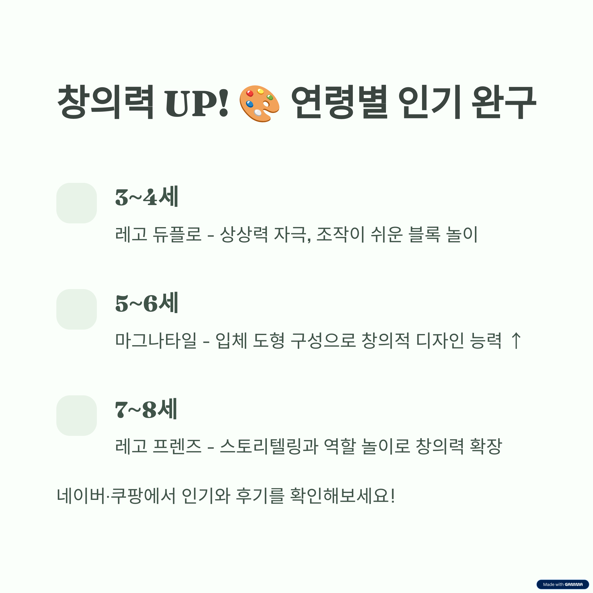 | 5~6세 | 레고 클래식, 마그나타일, 클레이 키트 | 조립·창작, 컬러 다양, 손근육 발달 | 마그나타일 리뷰 3만건↑, 5~10만 원 |