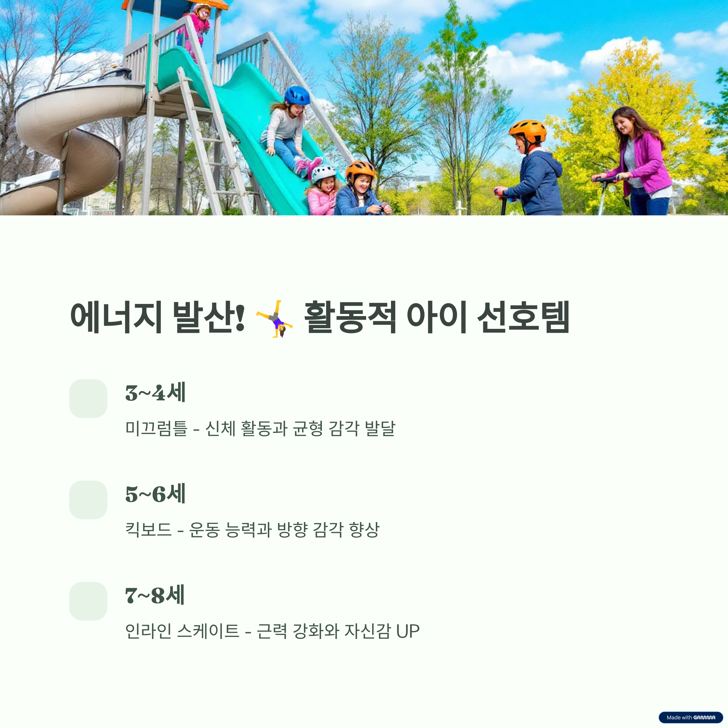 | 5~6세 | 마이크로 킥보드, 줄넘기, 미니 농구대 | 균형감각, 실외, 협동 | 킥보드 연간 120만대↑, 7~12만 원 |