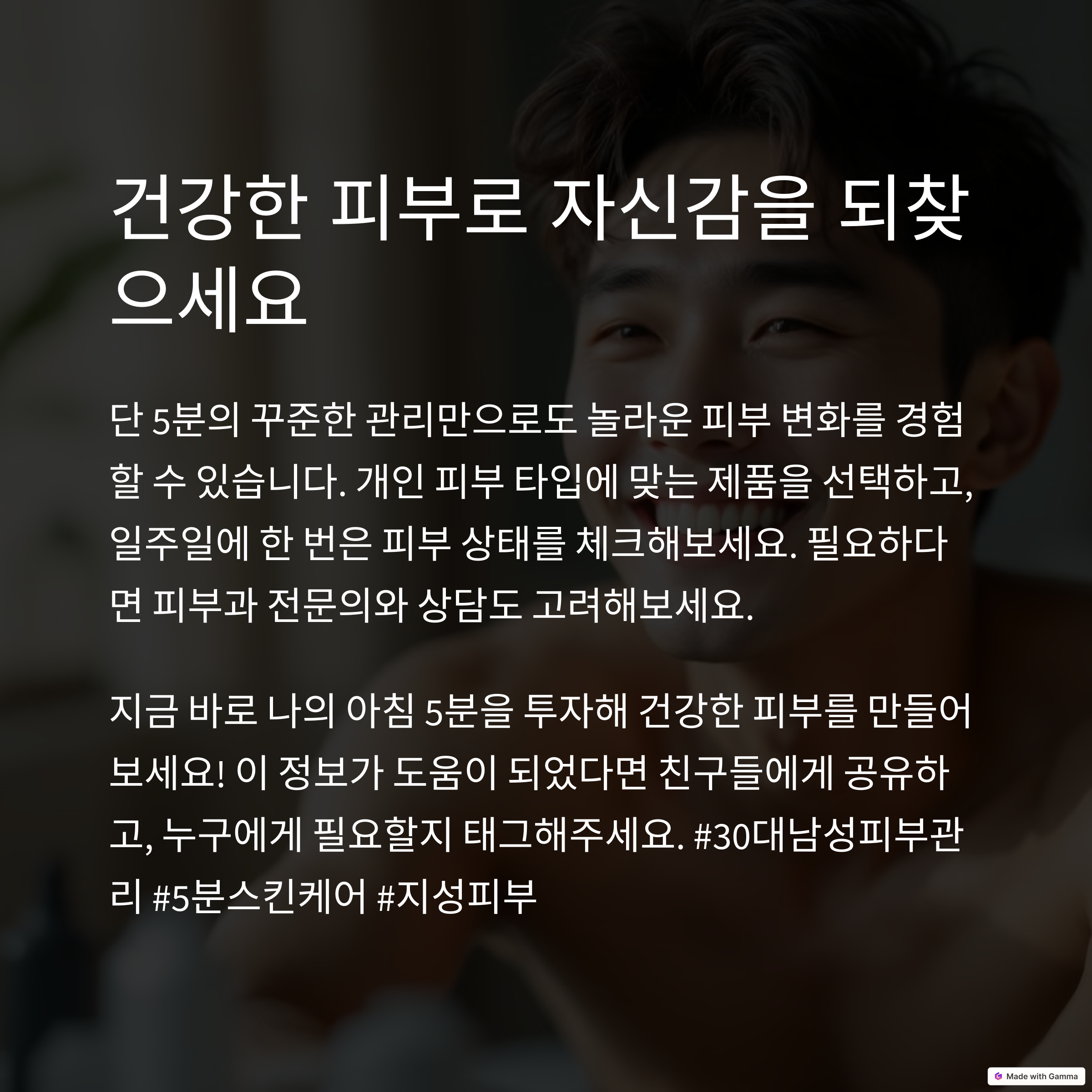 30대 남성이 아침 5분만 투자해도 지성 피부를 건강하게 관리할 수 있습니다. 약산성 클렌징, 피지 조절 토너, 트러블 케어 세럼, 산뜻한 보습제, 자외선 차단제를 포함한 간단한 루틴으로 번들거림 없이 촉촉하고 깨끗한 꿀피부를 만들어보세요! 꾸준히 실천하면 눈에 띄는 변화를 경험할 수 있습니다. 지성 피부를 관리하지 않으면 모공 확장, 피부 노화, 각질 및 여드름 문제가 발생할 수 있으므로, 꾸준한 관리가 중요합니다.