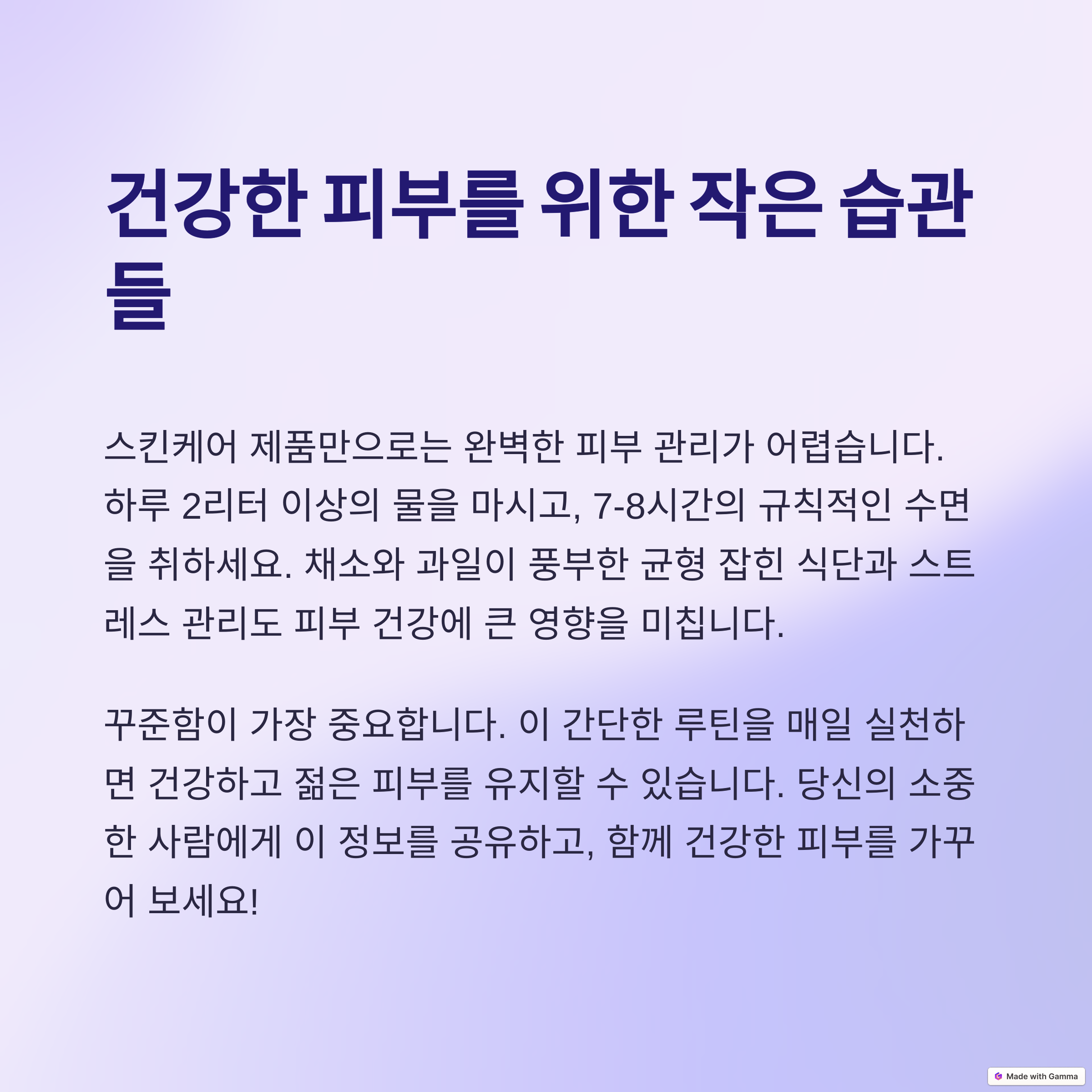 - 충분한 수면: 매일 7~8시간의 수면은 피부 재생에 필수적입니다.