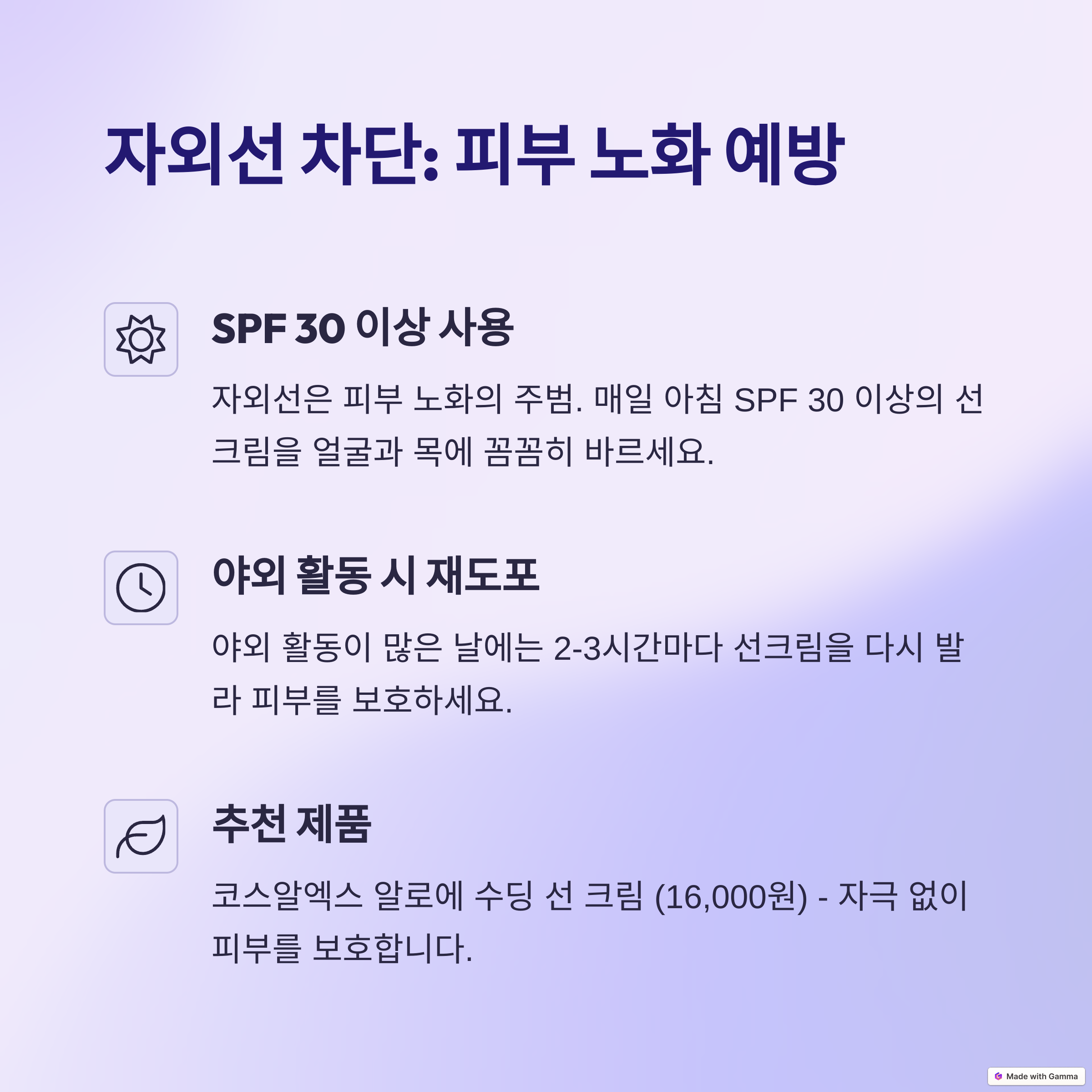 - 방법: SPF 30 이상의 자외선 차단제를 얼굴과 목에 꼼꼼히 바르기.